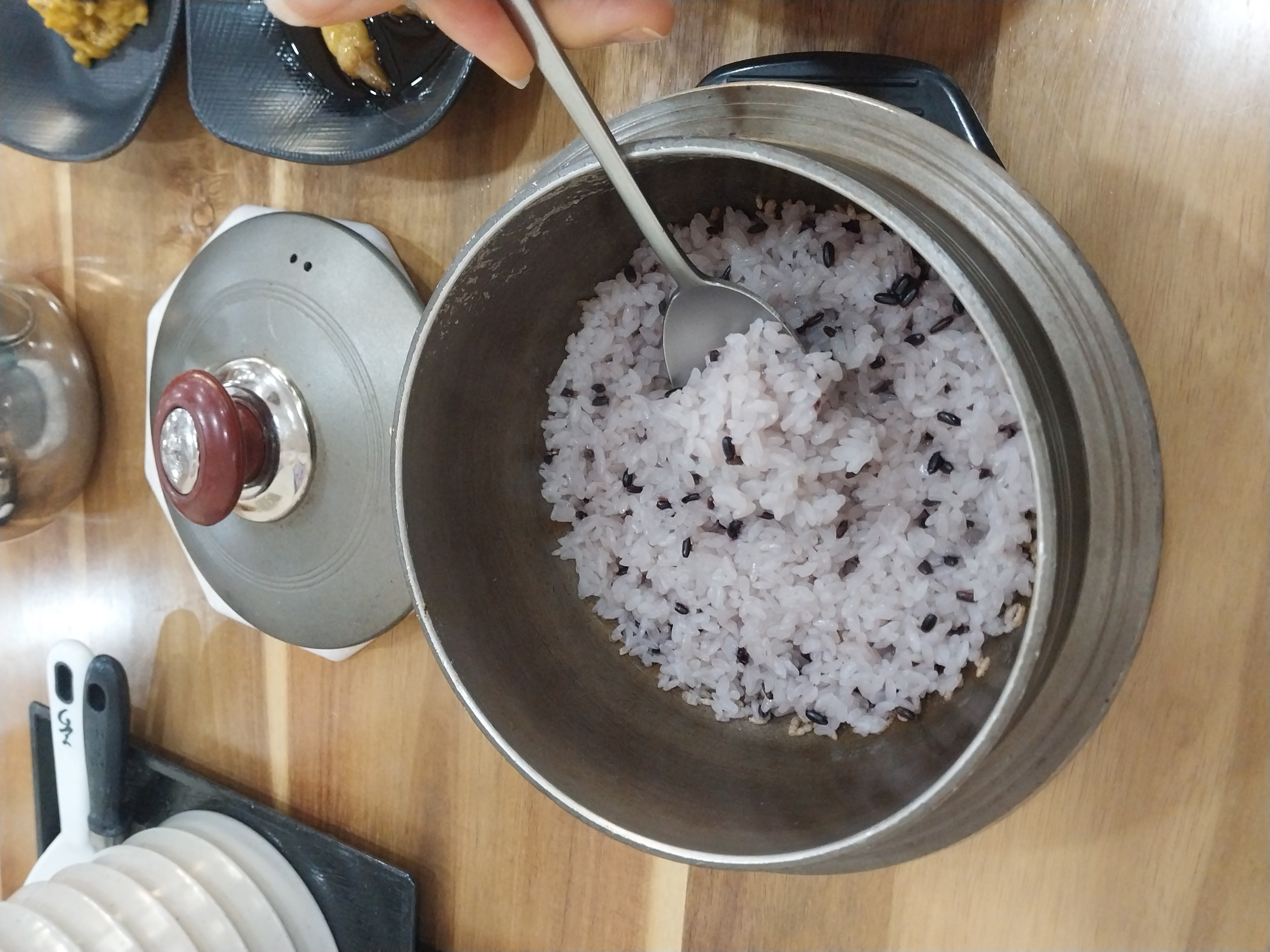 솥밥으로 바로 지은 밥이라 고소한 향이 가득하고, 쌀과 흑미가 어우러져 고슬고슬하고 담백한 맛이 살아있어요.