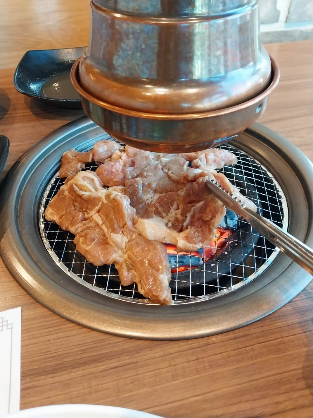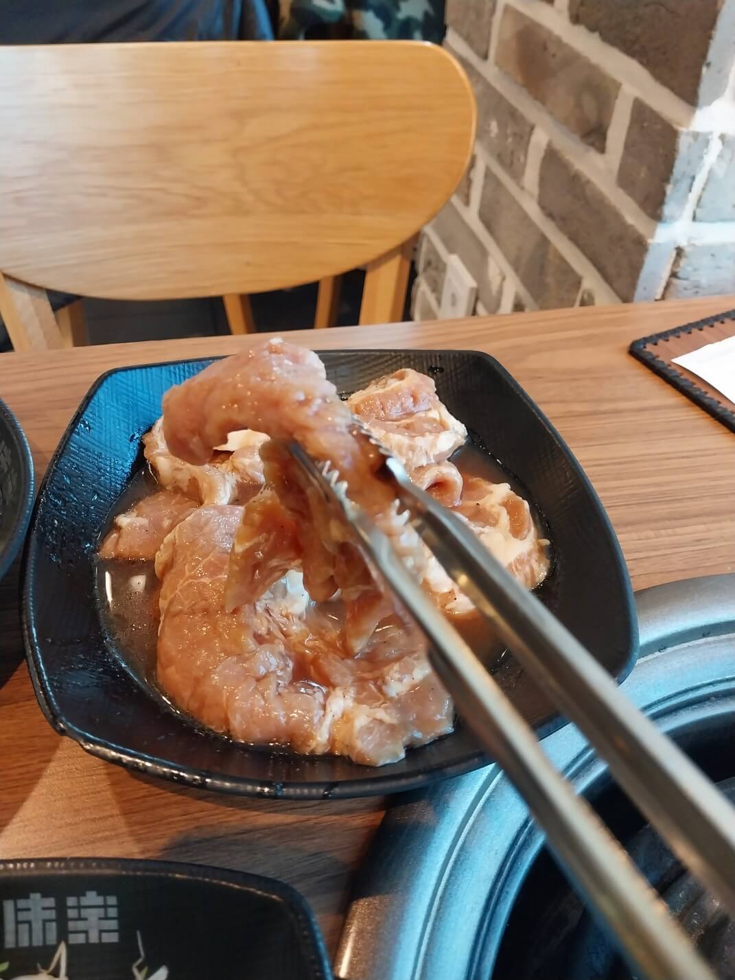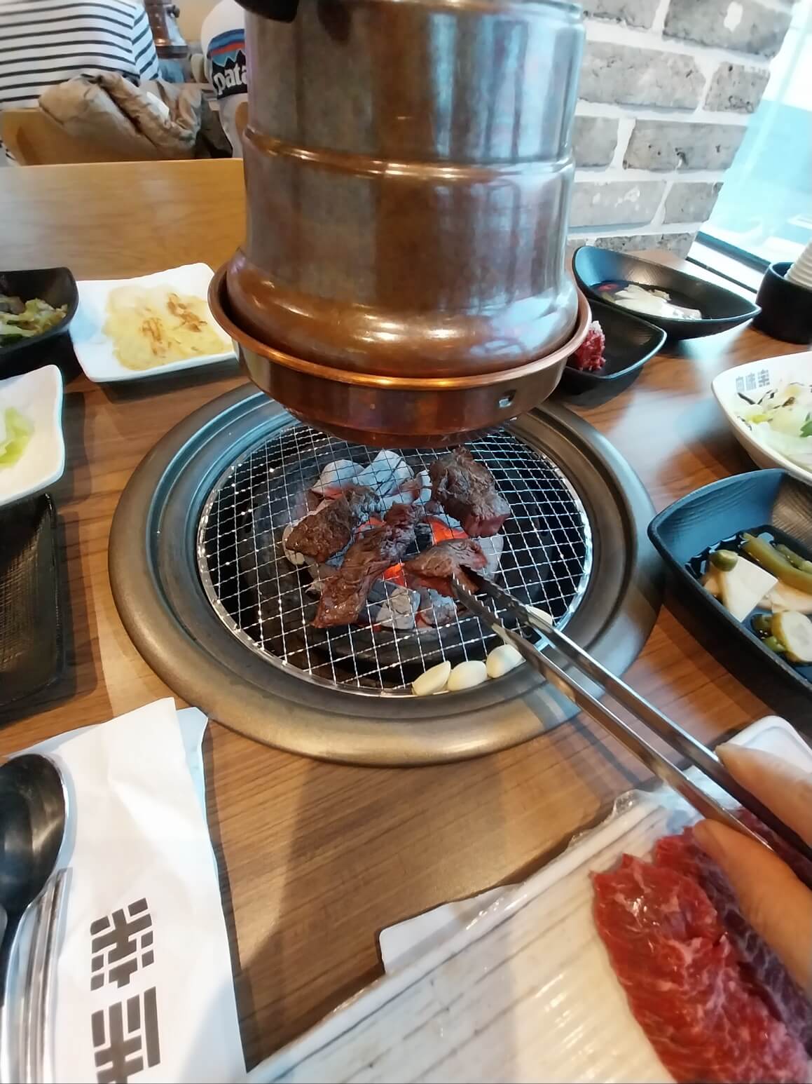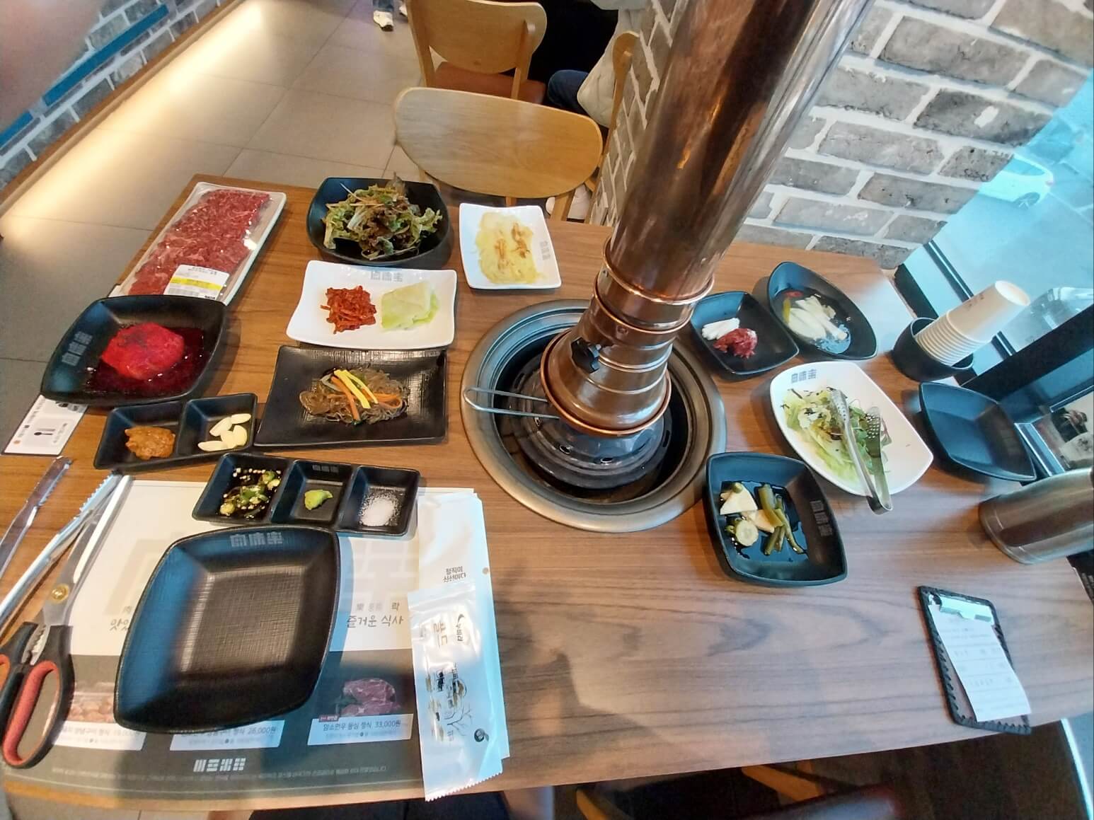 구입한 고기를 카운터에서 계산하고 자리를 잡고 앉습니다.