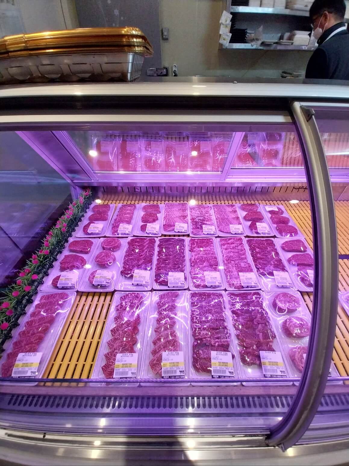 힝싱 신선하고 맛난 국내산 한우 소고기가 부위별로 나뉘어서 디스플레이되어 있는데요.