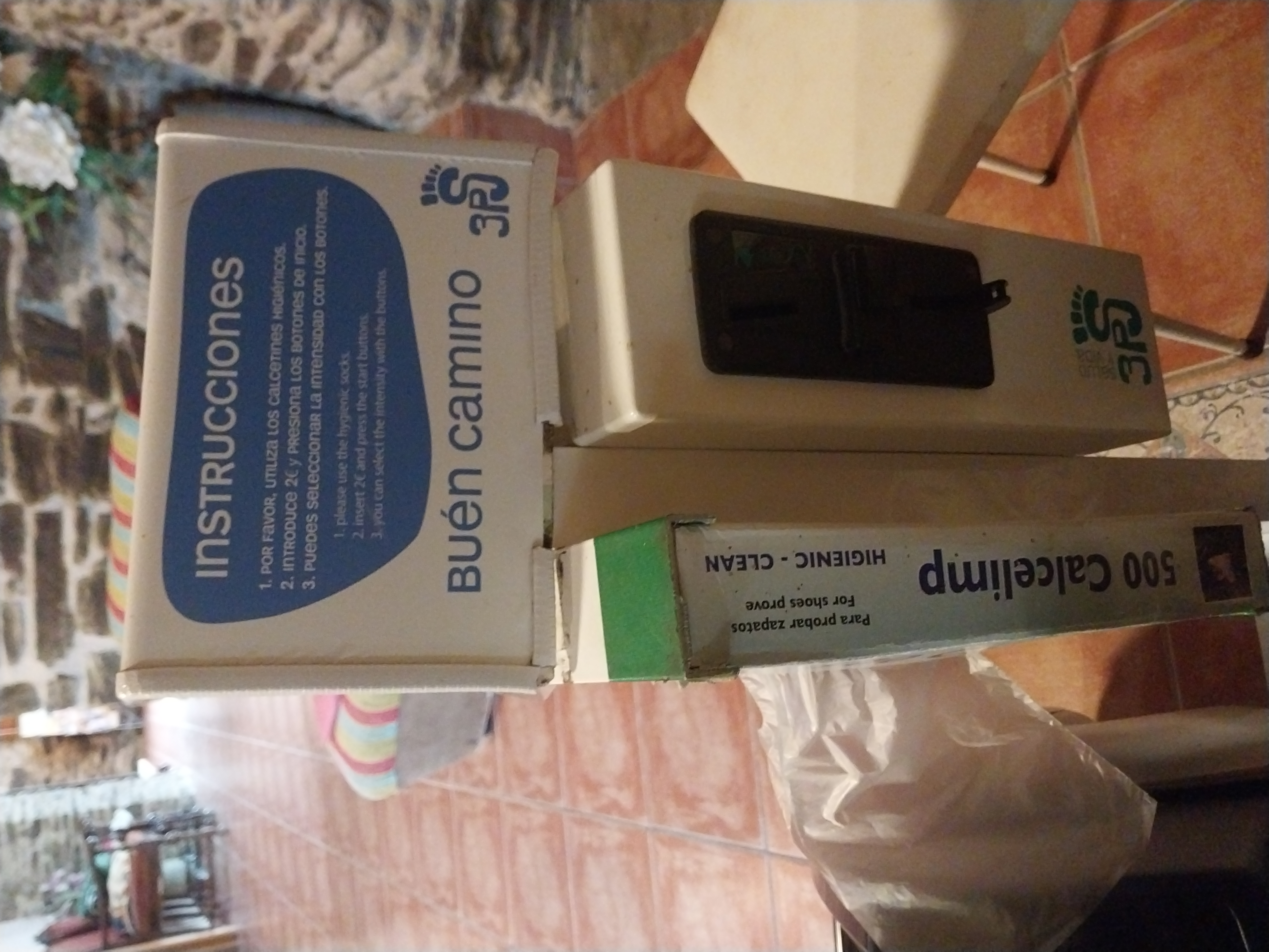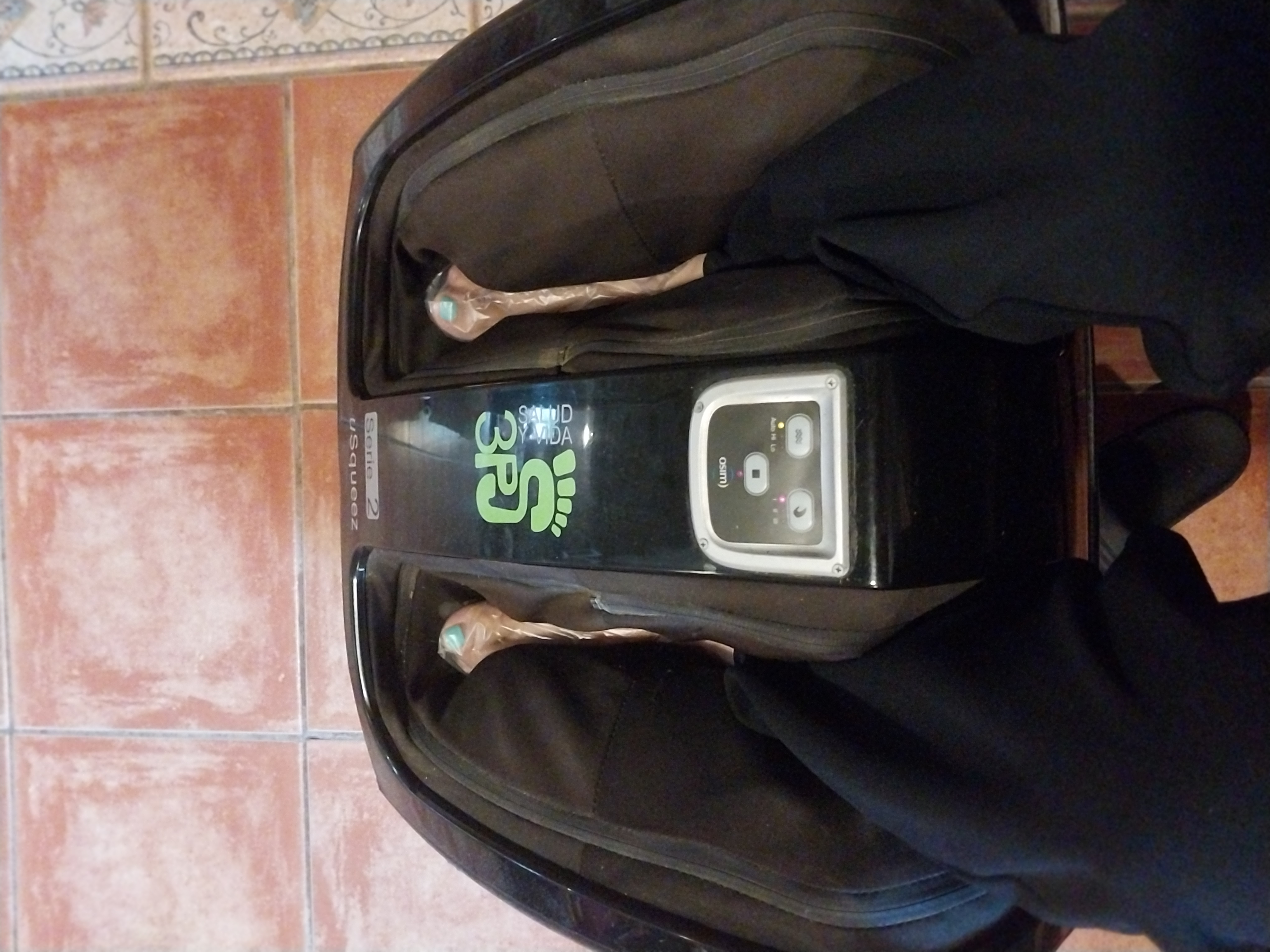 1회용 비닐양말을 먼저 신고 마사지 기계에 발을 넣었습니다.