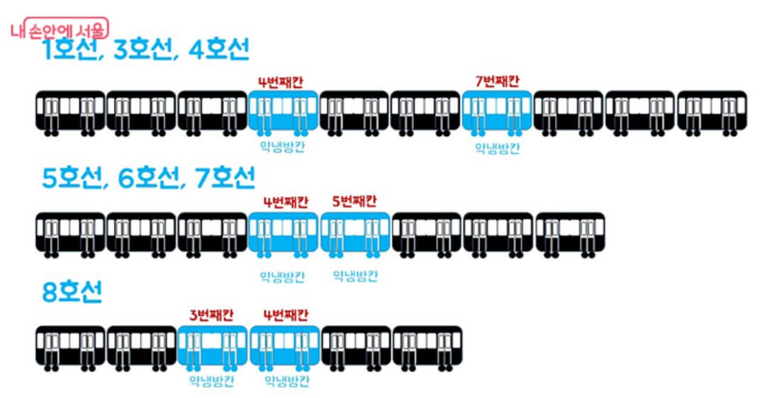 ▣ 1,3,4호선 : 약냉방칸 4번째 , 7번째 칸