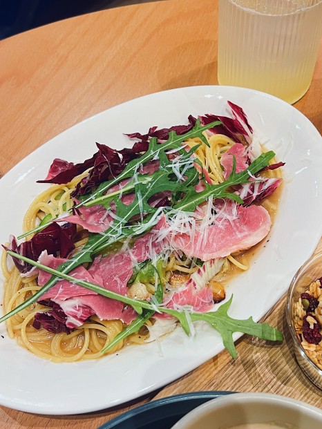 잠봉 멸치 파스타, 치즈구이 샌드위치와 커스터드 팬케이크가 있습니다.