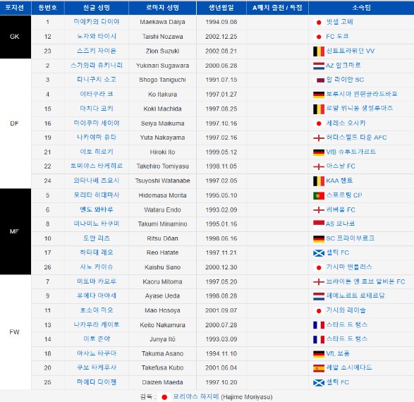 일본은 현재 26명의 선수 중 20명이 해외파인 최강의 만만치 않은 스쾃을 내세우고 있습니다.