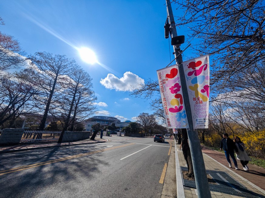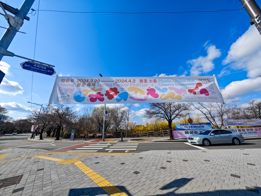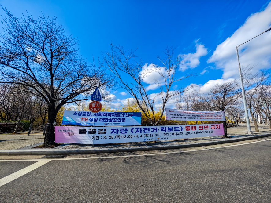 여의서로 인도를 따라서 걸어가다 보면 이번에 열리는 2024년 영등포 여의도 봄꽃축제를 홍보하는 플래카드가 걸려 있습니다. 축제 시작 3일 전에 찾아와서 어쩔 수 없지는 하지만 그래도 꽃이 일부 피어 있지 않을까 하는 기대와 다르게 벚꽃이 개화하지 않는 상태라 약간 실망스럽기도 합니다.
