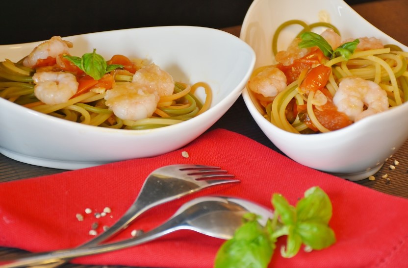올리브유에 마늘과 페퍼론치노를 넣고 끓이다가 새우를 넣고 소금, 후추로 간을 한 뒤 파슬리 가루, 바질 가루를 뿌려주면 끝이에요.