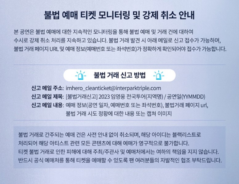 인터파크 예매창으로 가니 이렇게 불법 예매 티켓 모니터링 경고문이 있었으며, 실제로 17명 정도 소명자료를 보내달라는 안내문이 있었습니다! 우리 모두 깔끔한 콘서트 문화를 만들어요 ^^