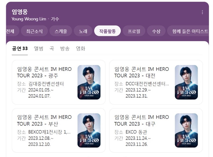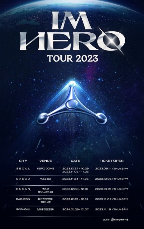 *대구는 11월 24일부터 26일. *부산은 12월 8일부터 12월 10일. *대전은 12월 29일부터 31일. *광주는 내년 2024년 1월 5일부터 7일까지. IM HERO TOUR 2023 투어 일정입니다!