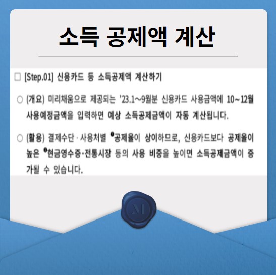 23년도 1월부터 9월분까지의 신용카드 사용액을 미리채움으로 제공받게 되고, 10월부터 12월까지 3개월간은 본인의 예상소비금액을 가상으로 입력하여 소득공제금액을 미리 계산하여 예상해 볼 수 있습니다.