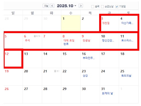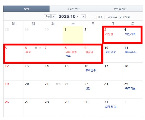 그리고 10월 3일 개천절이 금요일이고 9일 한글날이 목요일입니다.