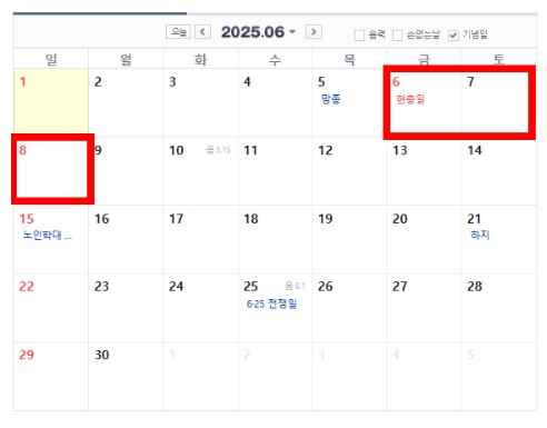 2025년 6월 6일 현충일이 금요일에 위치하며