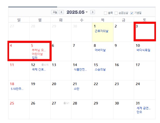 이건 사실 좀 아쉬운데, 어린이날과 부처님 오신 날이 합쳐졌습니다.