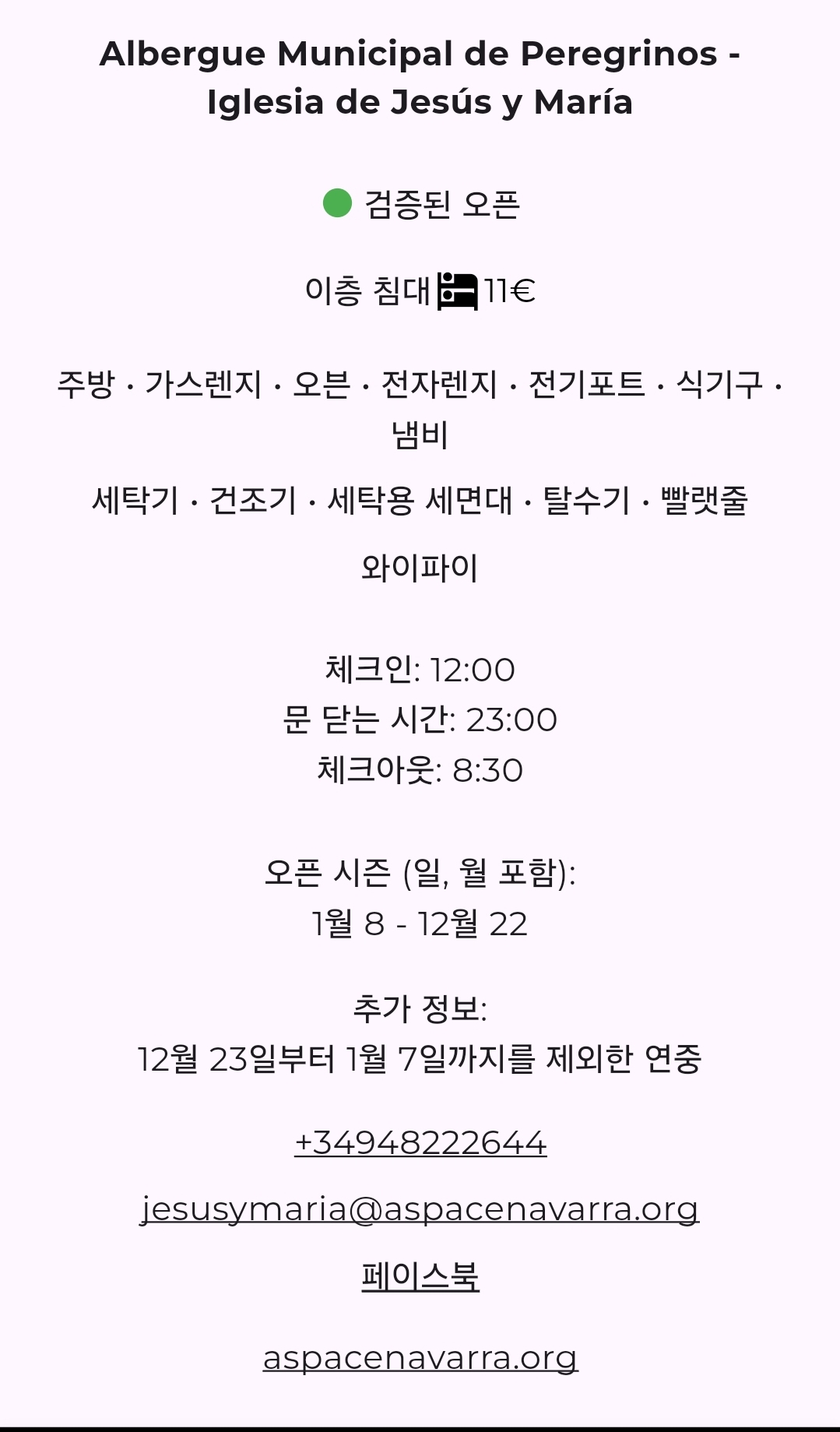 산티아고 닌자 앱에서 팜플로나 알베르게 정보 알 수 있습니다.